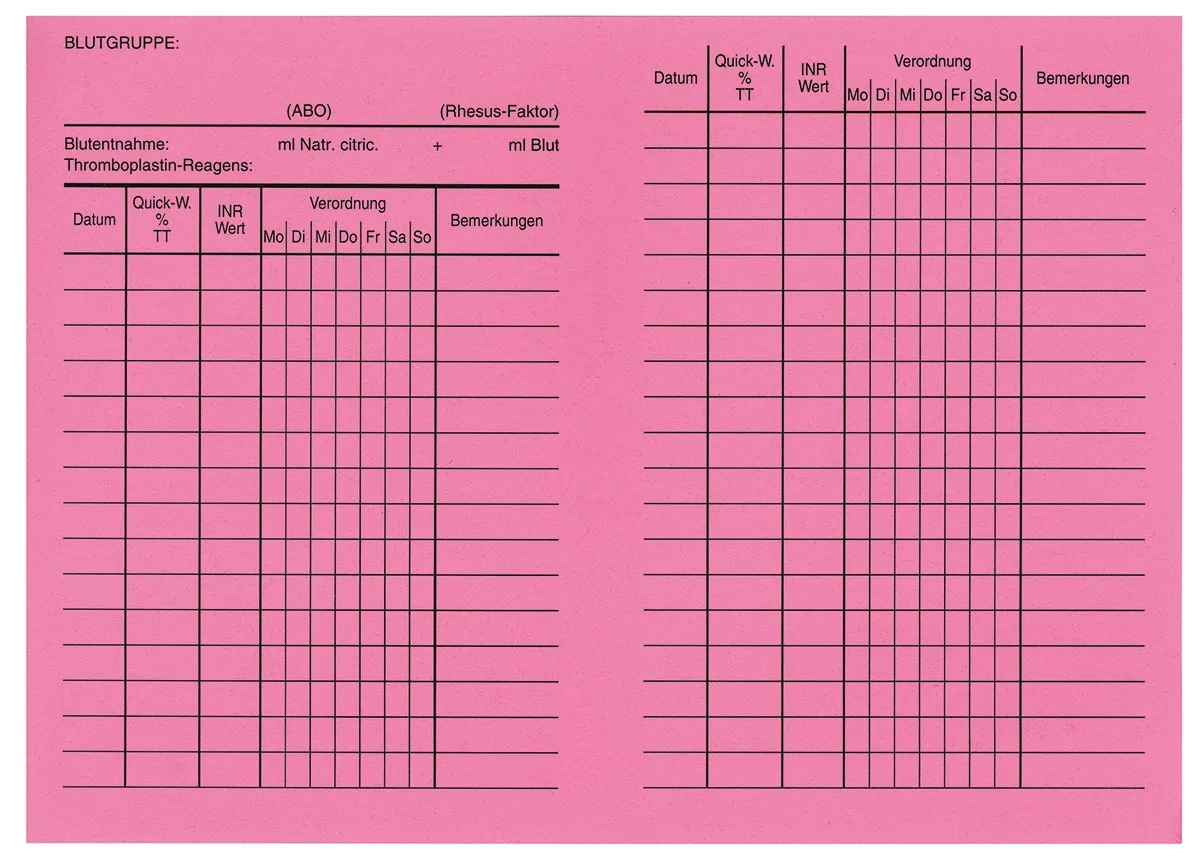Der Antikoagulantien-Pass des Deutschen Ärzteverlages ist aus sehr robustem, gut beschreibbarem Spezialpapier gefertigt, damit er immer von Patienten mitgeführt und bei Untersuchungen oder Notfällen eingesehen werden kann. Durch den praktischen Vordruck können gemessene Werte und verordnete Dosierungen schnell und einfach durch den Arzt eingetragen werden.