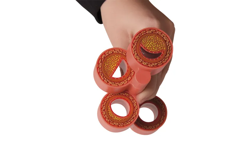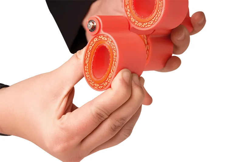 Zu sehen ist der fortschreitende Aufbau von Fetteinlagerungen (Cholesterin) und die Bildung von Plaque bis hin zum Gefäßverschluss. Das Arterienmodell simuliert die schwindende Gefäßelastizität einer echten Arterie. Beginnend mit der weichen, gesunden Arterie bis hin zur blockierten Arterie in hartem Material.