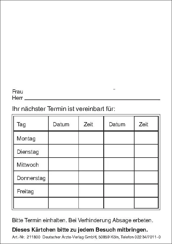 Bestellen Sie jetzt die Behandlungs-/Terminkarte A7 (mit Aufdruck) im Shop des Deutschen Ärzteverlages.