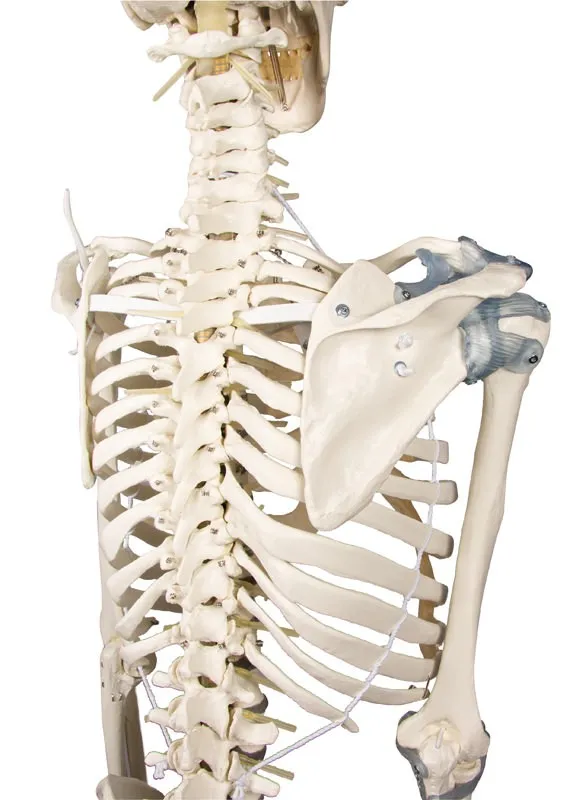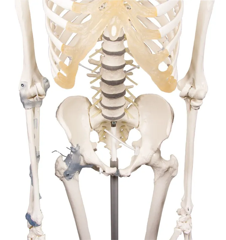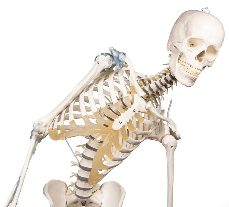 Um den steigenden Anforderungen der Ausbildung in der Therapie gerecht zu werden, bieten dieses Therapieskelett eine voll bewegliche Wirbelsäule. Montiert auf einem sehr robusten und zugleich maximal flexiblen Metall- Spiralschlauch kann die Wirbelsäule einfach in jede Position gebracht werden. Neben normalen Haltungen können auch Fehlstellungen und -haltungen demonstriert werden. Durch die speziellen flexiblen Bandscheiben kann die Wirbelsäule nicht nur gebogen, sondern auch in sich gedreht werden. Die Bandscheiben verhalten sich beim Biegen der Wirbelsäule wie natürliche Bandscheiben. Dadurch lässt sich die Wirbelsäule anatomisch korrekt biegen, ohne dass zwischen Bandscheibe und Wirbelkörper ein Spalt entsteht. Das Rückenmark und die austretenden Spinalnerven sind ebenfalls dargestellt.