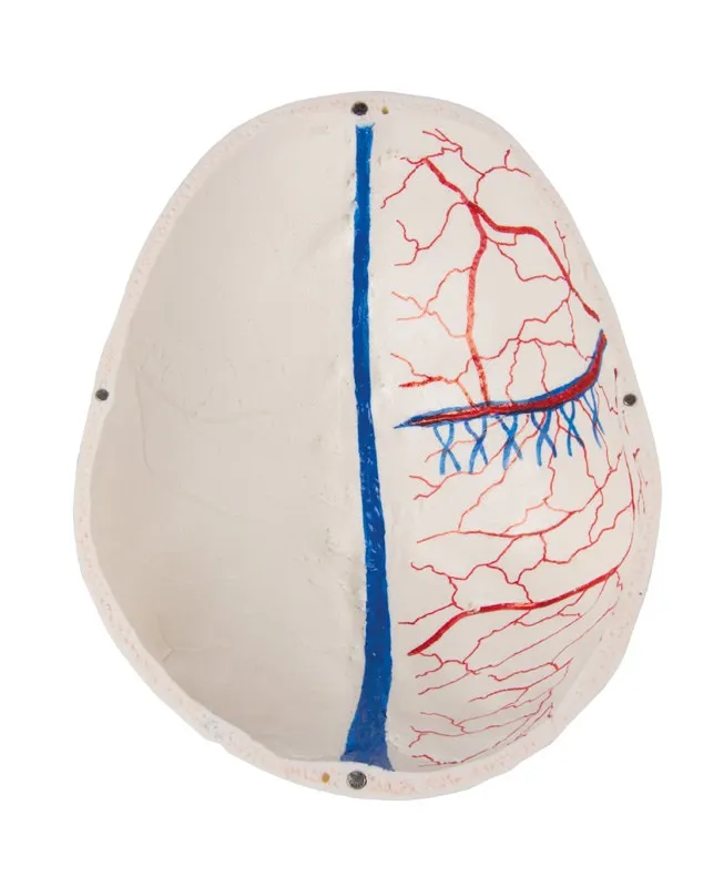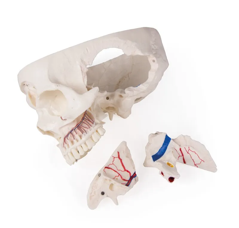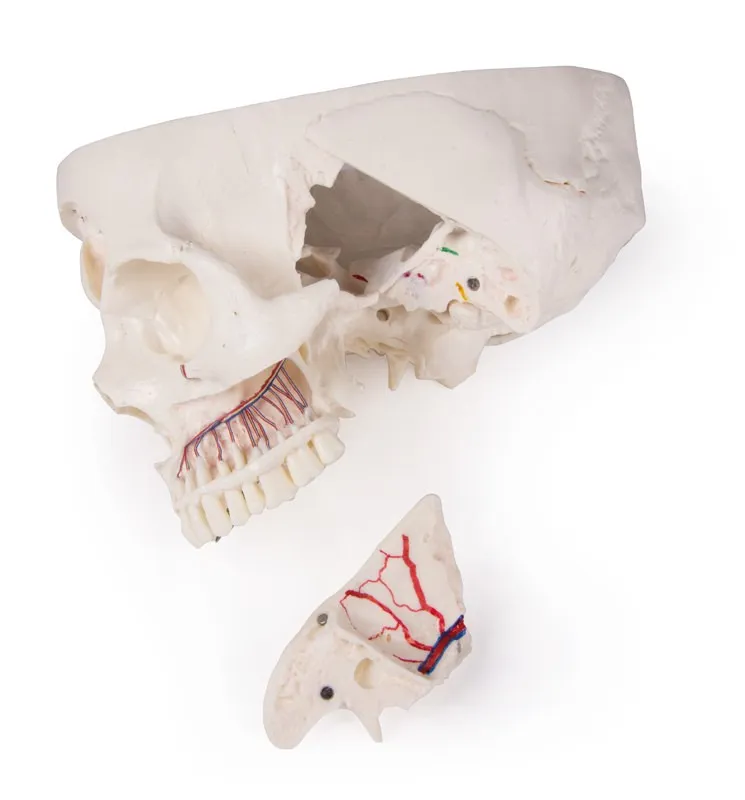 Das Schädeldach ist eröffnet und abnehmbar, lässt aber die Schläfenbeine und ihre Nähte unberührt. Knöcherne Impressionen des sinus sagittalis, des sinus transversus und des sinus sigmoideus wie auch der Hirnhautgefäße sind bemalt. Die Schädelbasis ist sagittal geschnitten in der Form, dass der Schnitt auf einer Seite durch eine Siebplatte und ein weiterer Schnitt mit gleicher Ebene durch die andere Siebplatte des Siebbeins verläuft, was die Christa galli und die Lamina perpendicularis wie auch die ganze Nasenscheidewand intakt lässt. Die Strukturen der vorderen, mittleren und hinteren Schädelgrube sind einfach zugänglich. Man kann direkt die Nasenhöhle, die Nasenmuschel, das Septum sowie den knöchernen Rachenraum und Nasenrachenraum sehen. Die Nasenscheidewand kann aus den umgebenden Knochenstrukturen entnommen werden. Die Stirnhöhlen sind auf der einen Seite als Ganzes präpariert, auf der anderen Seite eröffnet, so dass sie voll zugänglich ist. Die Beziehung des Sinus zur Nasenhöhle ist klar erkennbar. Auf einer Seite des Schädels wurde das Schläfenbein in situ belassen. Das andere Schläfenbein ist aus dem Schädel herausnehmbar. Ein Teil des Warzenfortsatzes und der Schläfenbeinschuppe zusammen mit dem Antrum mastoideum können herausgenommen werden und bieten freie Sicht auf das Innenohr. Alle drei Bogengänge sind sichtbar zusammen mit dem Verlauf des N. facialis, der nach hinten und dann nach unten verläuft und letztendlich durch das Foramen stylomastoideum hindurchtritt. Das herausnehmbare Schläfenbein zeigt einen vollständigen äußeren Gehörgang. Ein fast senkrechter Schnitt durch den Warzenfortsatz und dann weiter einwärts entlang der Fissura petrosquamosa teilt das Schläfenbein, und die Position des Trommelfells ist zu sehen. Der Canalis caroticus ist wie auch die Cochlea eröffnet und zeigt den inneren Gehörgang und der Verlauf des Gesichtsnervs ist zu erkennen. Das ovale Fenster, die Bogengänge sowie Öffnung der Paukenhöhle sind zu erkennen. Der Oberkiefer und der Unterkiefer zeigen die Strukturen des Gebisses, die Wurzeln, den knöchernen Rand des Alveolarfortsatzes sowie dentale Nerven und Gefäße. Die Oberkieferhöhle kann durch das Entfernen einer Klappe eröffnet werden. Die Zähne der rechten Unterkieferklappe sind halbiert und zeigen die inneren Strukturen der Zähne.