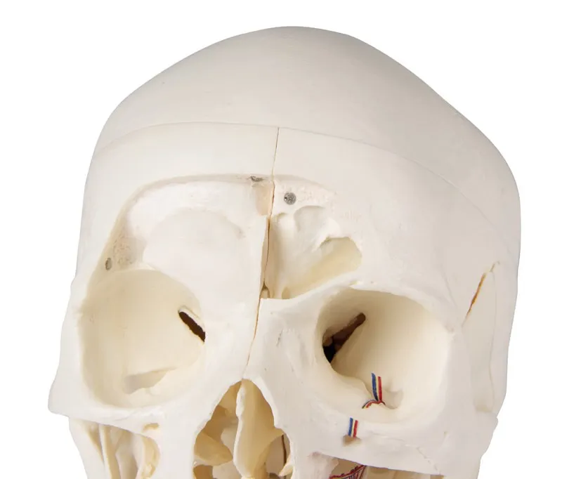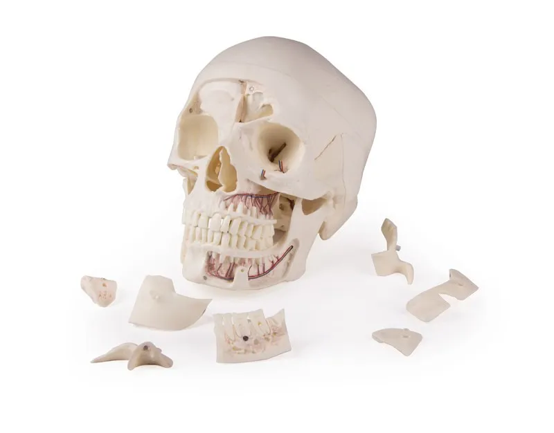 Dieses Schädelmodell ist ein Abguss eines echten menschlichen Schädelpräparats und zeigt alle anatomischen Strukturen in höchster Detailgenauigkeit. Der Schädel ist komplex geschnitten und mit Metall- und Magnetverbindungen zusammengefügt.