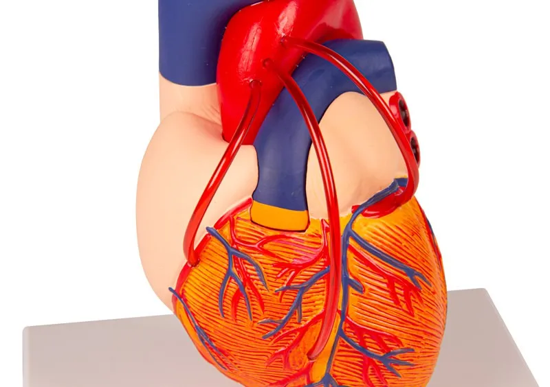 Dieses lebensgroße, 2-teilige Modell zeigt detailliert die Anatomie des menschlichen Herzens mit 3 Bypässen. Die Herzvorderwand kann abgenommen werden, um innere Strukturen wie Herzkammern und Herzklappen zu betrachten. Auf Stativ.