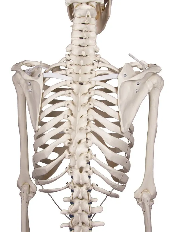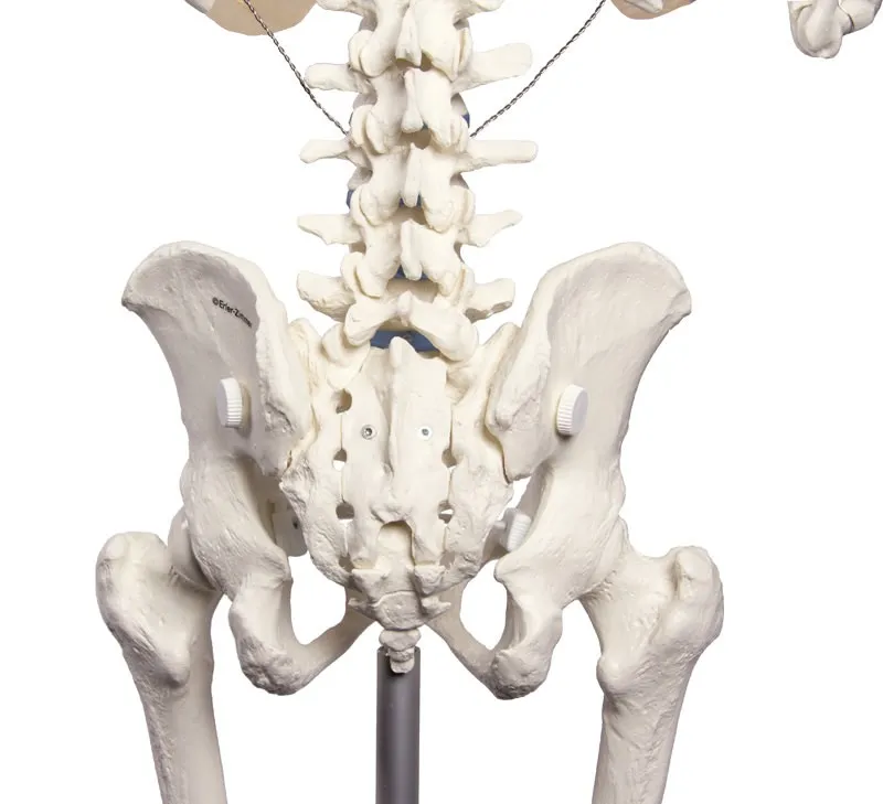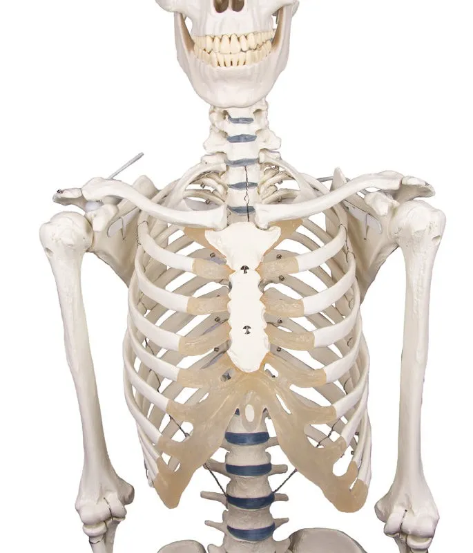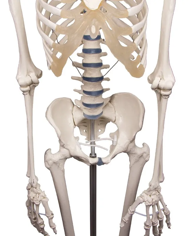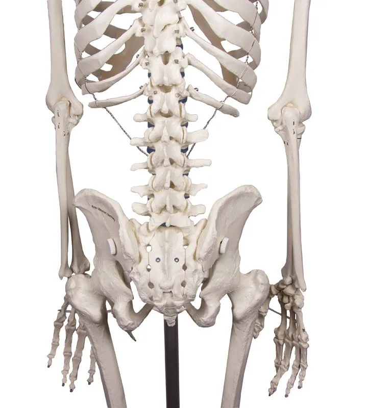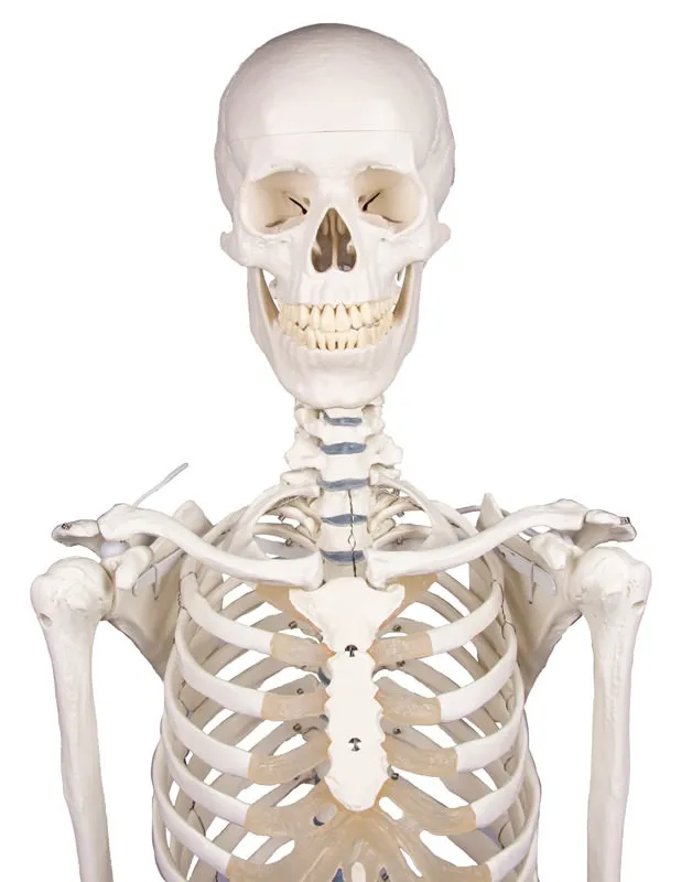 Dieses Modell ist ein Abguss eines natürlichen Skelettes in höchster Qualität und Detailtreue. Das Modell besteht aus widerstandsfähigem Kunststoff und zeigt alle anatomischen Details, Strukturen, Fissuren, Foramina und Processus. Alle Knochen sind einzeln gefertigt und sorgfältig zusammengebaut. Hände und Füße sind flexibel auf Draht montiert. Arme, Beine und der Schädel können leicht abgenommen und zum Teil zerlegt werden. Das 5-strahlige Rollenstativ gibt dem Modell immer sicheren Stand und ermöglicht den einfachen Transport von Raum zu Raum.