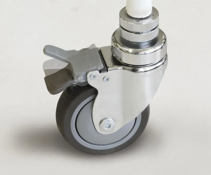 Fahrbare Ausführung mit zwei lenkbaren Rollen und besonders komfortablen Feststellbremsen hinten