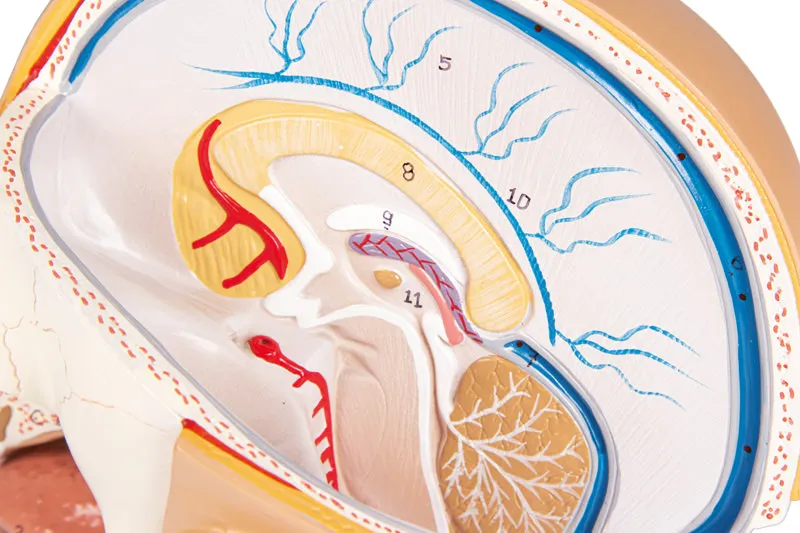 Die linke Seite des Gesichts ist sowohl auf sagittaler als auch auf horizontaler Ebene eröffnet und ermöglicht die Betrachtung der inneren Strukturen von Schädel und Gehirn sowie der Nasen- und Mundhöhle.