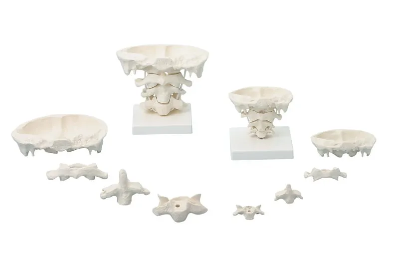 Dieses Modell besteht aus Halswirbel C3, Axis (Dreher) C2, Atlas C1 und einem Segment des Hinterhauptbeins. Alle Teile sind zur besseren Demonstration 2-fach vergrößert dargestellt. Mit diesem Modell können die Bewegungen im oberen Halswirbelbereich naturgetreu und anatomisch richtig nachvollzogen werden. Alle Bewegungsmöglichkeiten im Atlanto-occipital und Atlanto-axialgelenk sind nachweisbar.