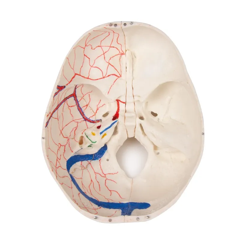 Das Schädeldach ist eröffnet und abnehmbar. Knöcherne Impressionen des sinus sagittalis, des sinus transversus und des sinus sigmoideus wie auch der Hirnhautgefäße sind bemalt. Die Schädelbasis ist sagittal geschnitten in der Form, dass der Schnitt auf einer Seite durch eine Siebplatte und ein weiterer Schnitt mit gleicher Ebene durch die andere Siebplatte des Siebbeins verläuft, was die Christa galli und die Lamina perpendicularis wie auch die ganze Nasenscheidewand intakt lässt.