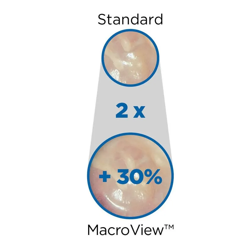 Das MacroView Prestige Otoskop LED Set 3,5 V mit Rachenleuchte bietet einen 2-mal so großes Blickfeld und eine stärkere Vergrößerung als die herkömmlichen Otoskope. Durch das größere Blickfeld und die stärkere Vergrößerung wird die Ansicht des Gehörgangs und des Trommelfells optimiert.