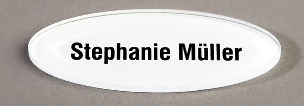 Mit den Namensschildern stellen Sie einen direkten Kontakt zu Ihren Patienten her. Diese haben damit die Möglichkeit, Ihre Mitarbeiter/-innen persönlich anzusprechen. Die Namensschilder aus Plexiglas sind in fünf verschiedenen Formen erhältlich. Dieses Namensschild wird 1-zeilig in schwarzer Schrift bedruckt.