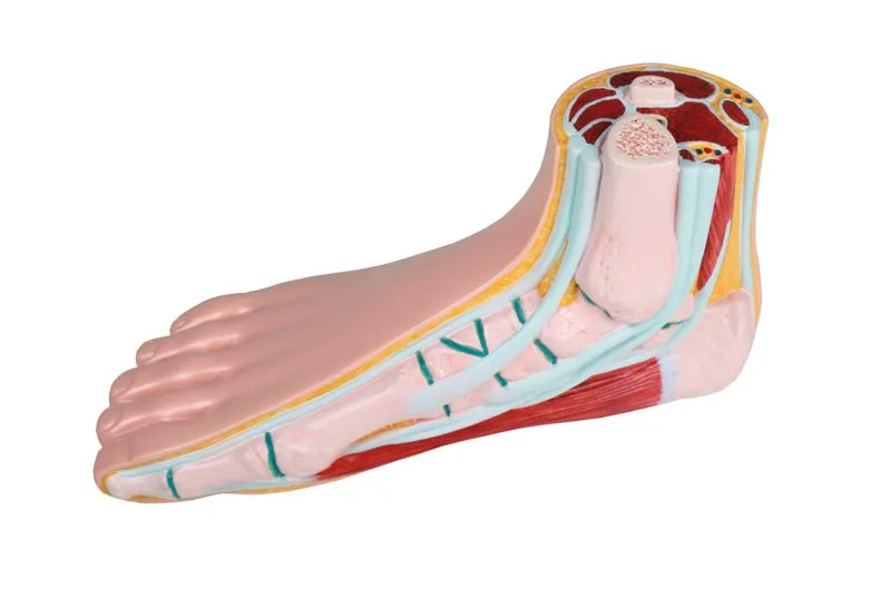 Dieses lebensgroße Modell eines rechten menschlichen Fußes ist medial eröffnet und zeigt Knochen, Gelenke, Bandapparat, Fettgewebe und Muskulatur. Der Ansatz des Unterschenkels ist ebenfalls als Querschnitt dargestellt und zeigt die Schnitte von Tibia und Fibula sowie die dort verlaufenden Muskulaturen, Bänder, Gefäße und des Fettgewebes.