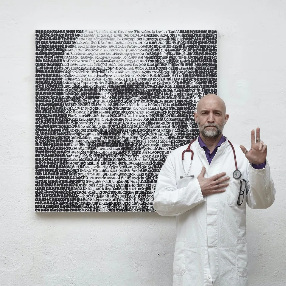 Der Kölner Arzt und Künstler SAXA (Dr. Sascha A. Lehmann) hat für sein Porträt des Hippokrates sowohl die offizielle Übersetzung des historischen Hippokratischen Eides als auch die der aktuellen Version der Deklaration von Genf des Weltärztebundes aus dem Jahre 2017 verwendet. Hippokrates von Kos, ca. 460 bis 370 v. Chr. gilt als der berühmteste Arzt des Altertums, Vater der modernen Medizin und Begründer der Medizin als Wissenschaft. Der nach ihm benannte "Eid des Hippokrates" ist ein ursprünglich in griechischer Sprache verfasstes Arztgelöbnis und gilt als erste grundlegende Formulierung einer ärztlichen Ethik. Als zeitgemäße, ohne religiösen Kontext bestehende Version dieses Eides wurde 1948 auf der Generalversammlung des Weltärztebundes in Genf das "Genfer Gelöbnis" verabschiedet, das bis heute mehrfach revidiert wurde. Es ist in die (Muster-)Berufsordnung für die in Deutschland tätigen Ärztinnen und Ärzte übernommen und deren Präambel vorangestellt. Somit finden sich in der exklusiv für den Deutschen Ärzteverlag geschaffenen Wortmalerei sowohl der Ursprung als auch die gegenwärtig verwendete Version einer ärztlichen Ethik wieder.
