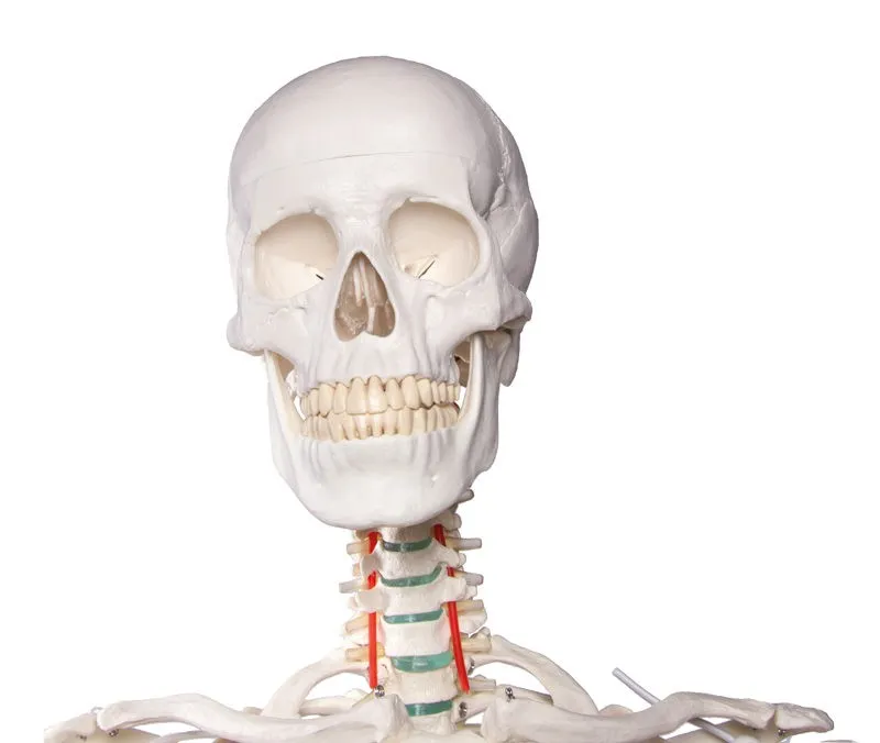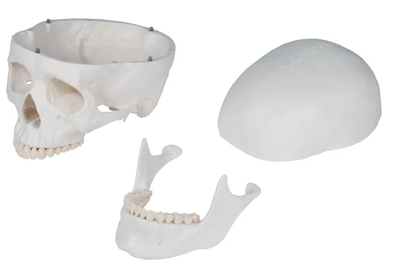 Der dreiteilige Schädel wurde digitalisiert und so angepasst, dass er genau der Standard-Anatomie entspricht. Die Größe entspricht der europäischen Durchschnittsgröße, alle wichtigen Strukturen, Fissuren, Foramina und Processus sind vorhanden. Der Schädel ist zerlegbar in Schädelbasis, Unterkiefer und Schädeldach. Das Schädeldach ist mit Metallstiften an der Schädelbasis ausgerichtet und wird durch Magnete gehalten. Es gibt keine störenden Verschlusshaken, die sich verbiegen oder abbrechen können.