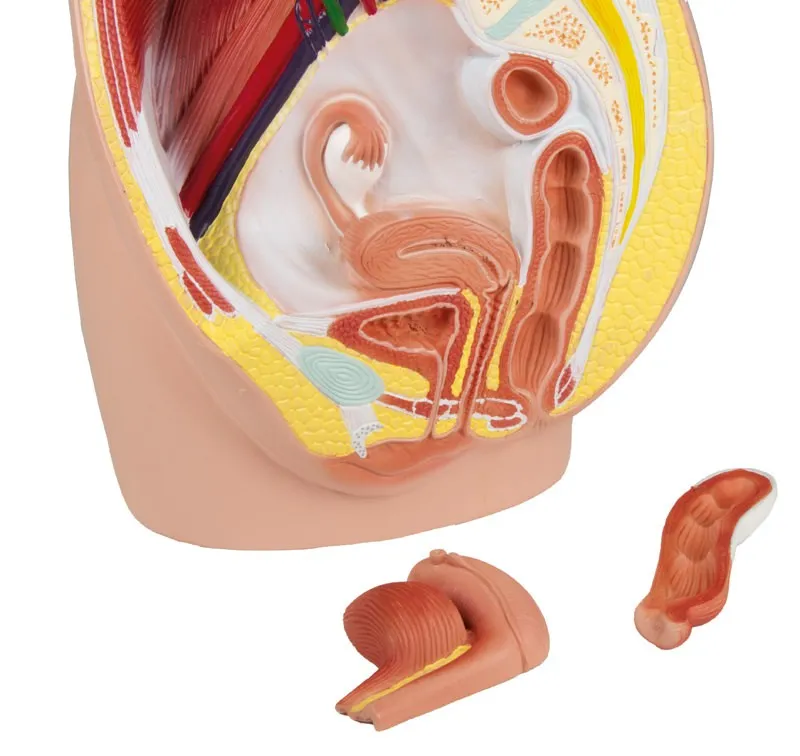 Dieses Modell in Lebensgröße ist auf der medianen Sagittalebene eröffnet. Es zeigt das weibliche Becken in drei Teilen. Neben der Muskulatur und Gefäßversorgung des Bauchraums zeigt das Modell insbesondere die urogenitalen Organe. Abnehmbar sind die Hälfte von Blase, Uterus und Vagina sowie eine Hälfte von Darm mit Rektum.
